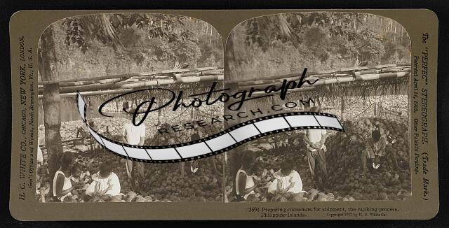 Preparing cocoanuts for shipment, the husking process, Philippine Islands