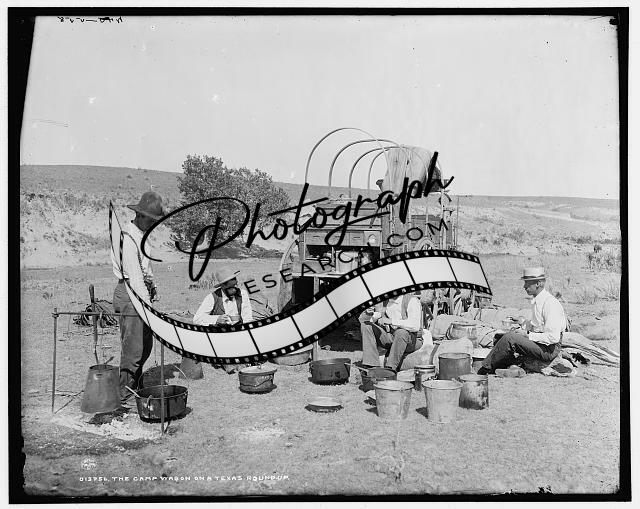 Camp wagon,Texas roundup,cowboys,cooking,food,chuckwagon,cowboys,TX,c1900