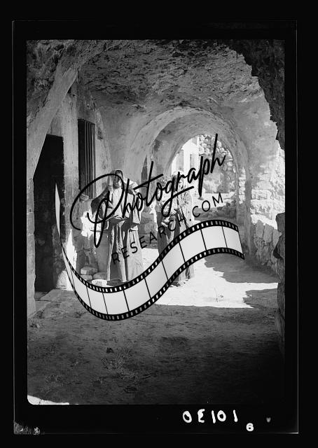 Women of Bethlehem grinding in courtyard before their home,West Bank,Middle East