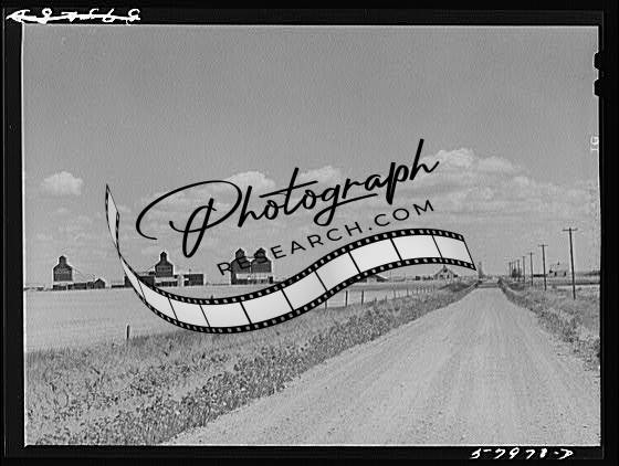 Title: Road with Homestead, Montana, and grain elevators on the horizon