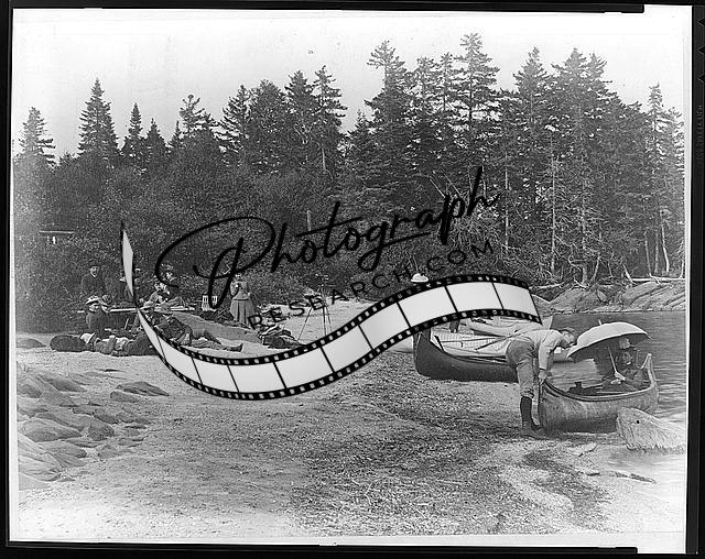 Picnic along shore of Lake,mouth of Socateau River,Maine,ME,Canoes,1884-1891