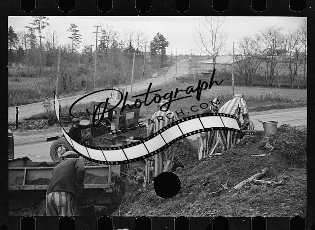 Convicts working,state road,workers,digging,shovels,trucks,North Carolina,1936