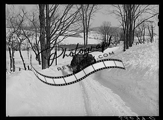 Horses hauling frozen truck to gas station from Upwey farm. Woodstock,Vermont