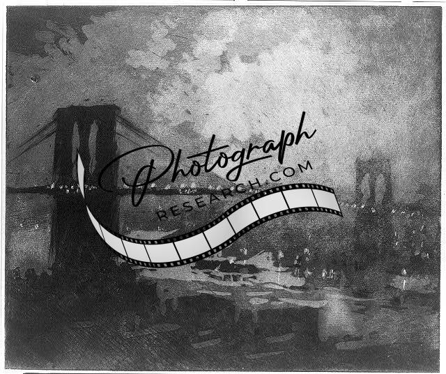 Brooklyn Bridge at night,1922,Joseph Pennell,Cityscape,Illuminated,Boats
