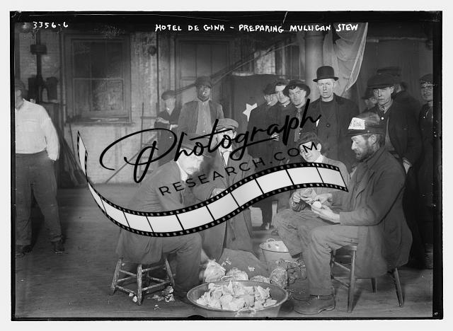 Hotel de Gink,preparing Muligan stew,men peeling potatos,smoking,wooden stools