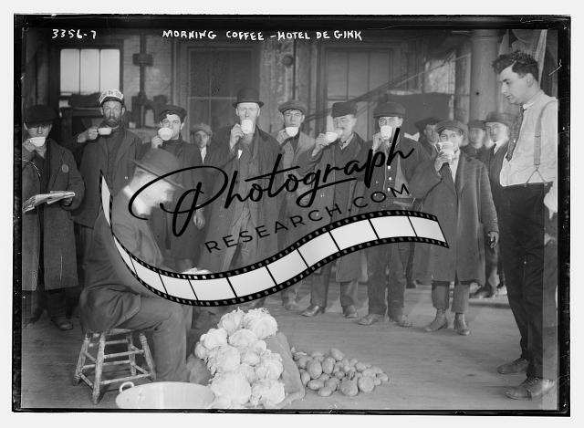 Hotel de Gink,morning coffee,group of men with cups of coffee,potatos,lettuce?
