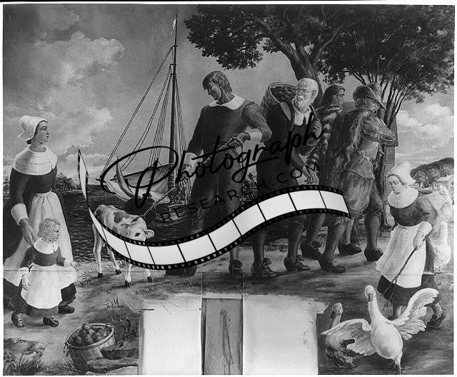 Greenwich, Conn. scene of early colonial life: men, women & children with furs, food baskets, calf, and ducks; small ship docked in background