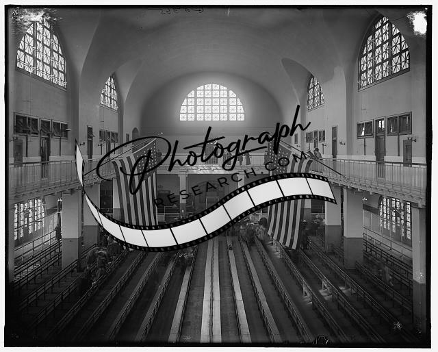 Inspection room,Ellis Island,immigration stations,flags,interior,New York,1900