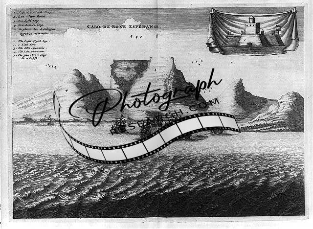 Cabo de Bone Esperanse,ships anchored in harbor,Cape of Good Hope,1676,Capetown