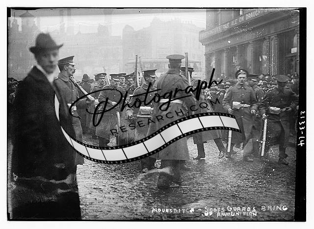 Hounsditch,Scots guards bring up ammunition,street,Bain News Service,policemen?