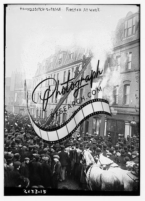 Hounsditch outrage,Firemen at work,fire,buildings,crowd of people,horses,Bain