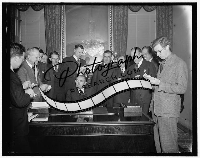 Title: House Appropriations Committee hears Secretary of Treasury and Budget Director. Washington, D.C., Dec. 16. Secretary of the Treasury Morgenthau and Acting Budget Director Daniel Bell discussed federal finances today with the House Appropriations Subcommittee considering the Treasury-Post Office Departmental Supply Bill. Secretary Mogenthau refused to say which points of the Bill were discussed at the meeting which was Executive. In the photograph, left to right: (front row) Sec. Morgenthau, Rep. James P. Buchanan, Chairman of the House Appropriations Committee; and Rep. John Taber of New York. Back row, left to right: Rep. Louis Ludlow, Chairman of Subcommittee on Appropriations and Post Offices; and Daniel Bell, Acting Director of the Budget