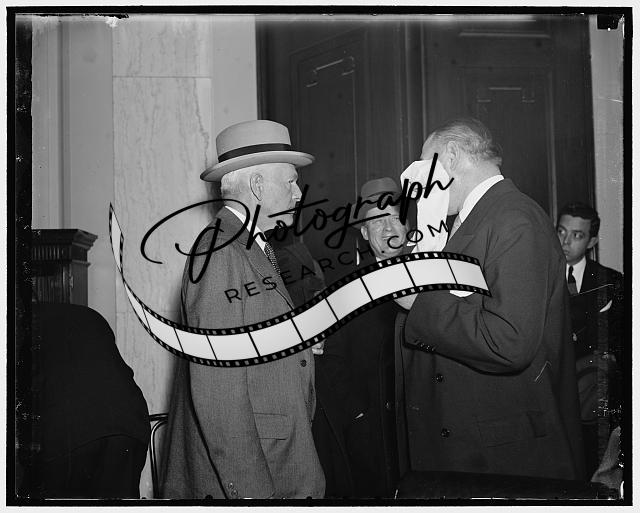 Title: Dr. Townsend and Representatives. Washington, D.C. Jan. 16. Photo shows Dr. Townsend explaining the new 'General Welfare Bill' which is that name the doctor is trying to have made a law thru the efforts of some of his Congressmen. Left to right: Dr. Francis E. Townsend, Rep. Nan Honeyman of Oregon, and Rep. Ralph O. Brews of Maine