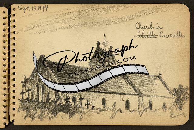 Church,Crasville,steeple,crosses,roof,outline,Manche,France,Victor Lundy,1944