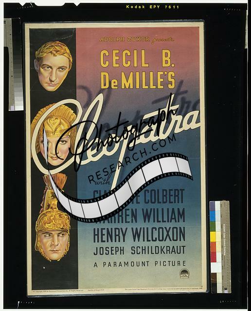 Motion picture poster for "Cecil B. DeMille's Cleopatra" showing headshots of stars Claudette Colbert, Warren William, and Henry Wilcoxon.