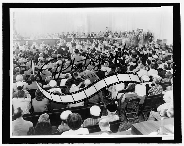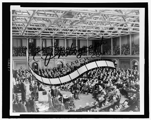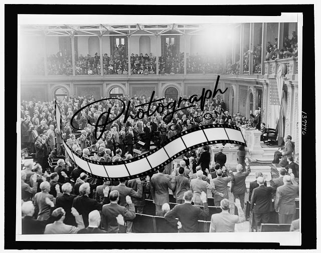 Summary: Photograph shows members of Congress being sworn in by Speaker Sam Rayburn as spectators watch from the gallery.