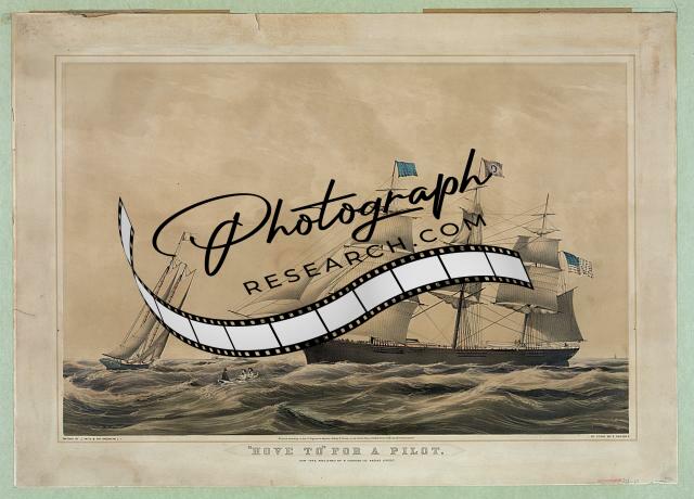 'Hove to' for a pilot,Currier & Ives Photo,Boats,c1856,waves,American Flag