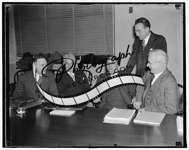 Title: Little fellow pays most of the taxes. Washington, D.C., Nov. 8. The House Ways and Means Sub-Committee learned today that taxpayers in the income bracket from $5,000 to $25,000 a year make most of the Capital gains and pay most of the tax, treasury experts who gave the information also presented a table showing that the Capital gains tax yielded $516,000,000 in 1929 and brought in approximately $85,000,000 last year, photographed at the hearing today were left to right: Cong. Robert Doughton, Chairman of the House Ways and Means Committee; Roswell Magill, Undersecretary of the Treasury; and Cong. Fred Vinson, Chairman of the House Sub-Committee. 11/8/37