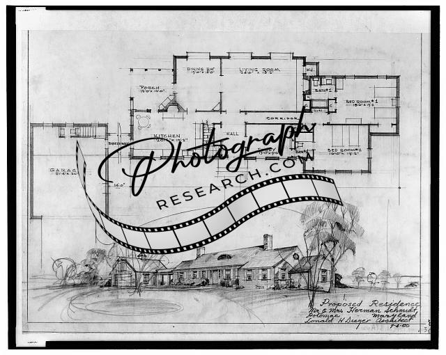 House ("residence") for Mr. and Mrs. Herman Schmidt, Potomac, Maryland. Floor plan and front perspective