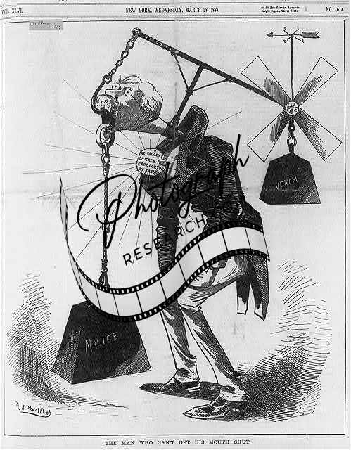 Political Cartoon,Senator John Ingalls,bigotry,venom,malice,1888,politician