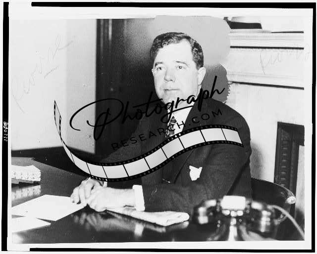 Summary: Huey P. Long, half-length portrait, seated at desk, facing left, pointing with left hand, talking to newsmen.