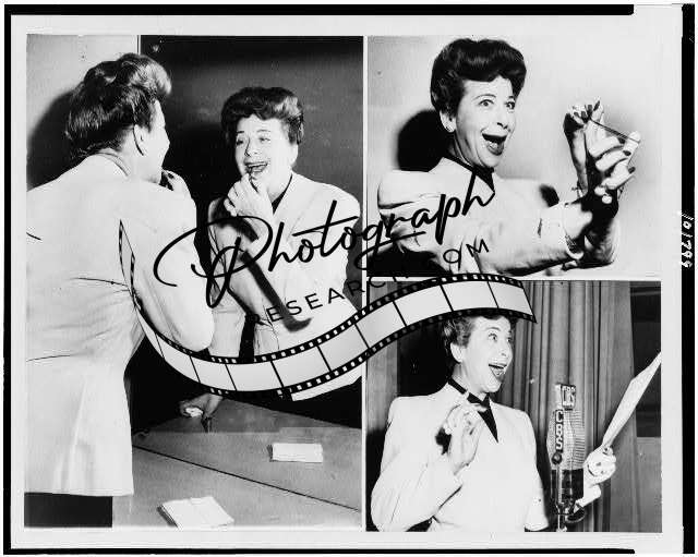 Composite,photos,Fanny Brice,lipstick,shooting rubberband,CBS microphone,1940