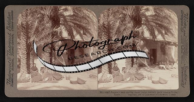 Farmer's wife sorting dates, under feathery palm trees in Elche, Spain