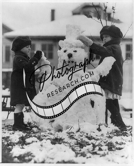 Dorothy,Caroline Seavey building snow man after 1st storm of season,Chicago,1929