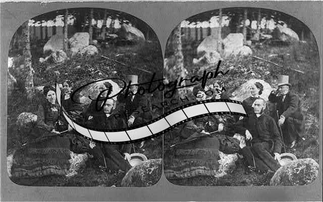 5 people among large rocks,c1870,Photograph,top hat,women,men