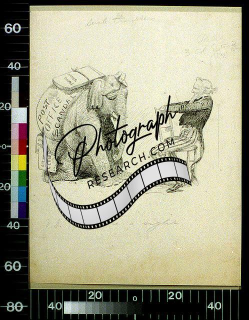 Summary: Cartoon showing Republican elephant, dressed as a prisoner, with chains and balls 'postal scandal,' 'army gloves,' and 'tomb stones' attached to its legs.
