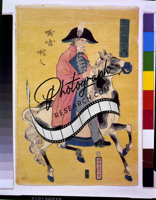Summary: Japanese print shows an Englishman on horseback. Includes text about England.