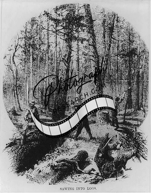 Sawing into Logs,chopping down a tree,men,Minnesota,MN,1870,Harper's Weekly