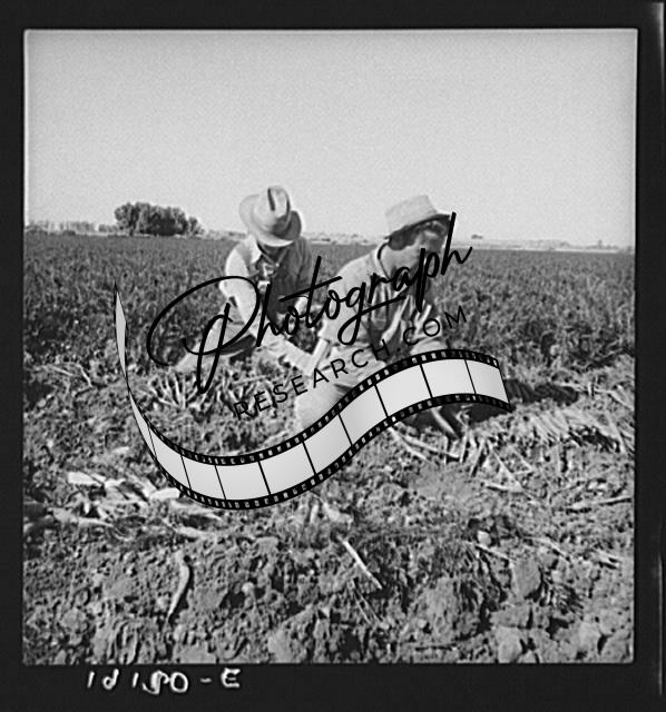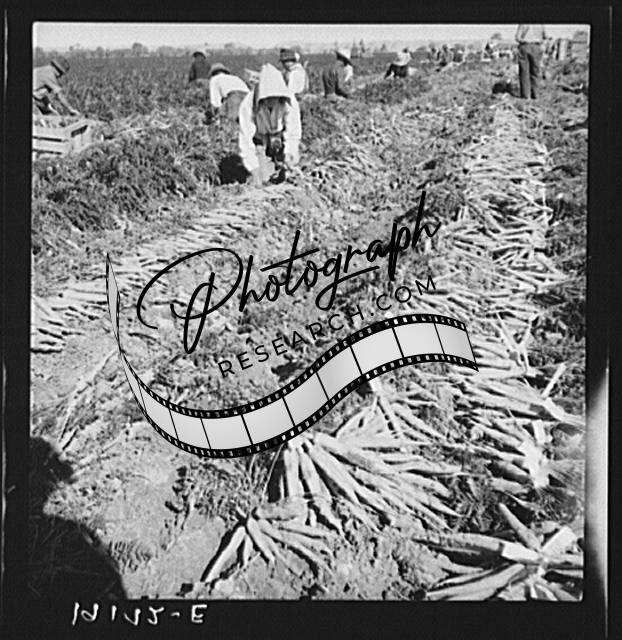 Title: Near Meloland, Imperial Valley. Large scale agriculture. Gang labor, Mexican and white, from the Southwest. Pull, clean, tie and crate carrots for the eastern market for eleven cents per crate of forty-eight bunches. Many can barely make one dollar a day. Heavy oversupply of labor and competition for jobs keen