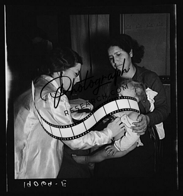 Title: Calipatria, Imperial Valley. Visiting public health doctor conducts well-baby clinic in local school building adjacent to pea harvest. Many migratory mothers attend