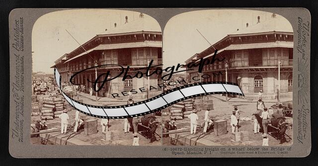 Handling freight on a wharf below the Bridge of Spain, Manila, P.I.