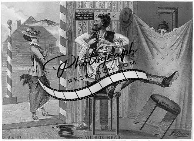 The village beau,June 9,c1882,Barber shop,woman holding umbrella,William Bruns