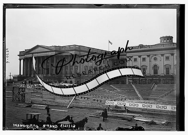 Summary: Photo shows construction of inaugural stand on the east front of the U.S. Capitol for the first inauguration of President Woodrow Wilson. Date written on negative: 3/21/13 is probably incorrect, as Wilson's inauguration took place on March 4, 1913.