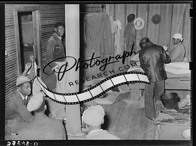Title: Group of Negro berry pickers huddled around the stove trying to keep warm on a cold day in the berry picking season. Near Independence, Louisiana
