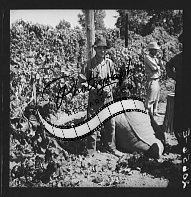 Title: Young migrant worker brings his hops to weigh scales. From five a.m. until noon, when photograph was made, he had picked eighty pounds, which equals eighty cents. Temperature 105 degrees. Oregon, Polk County, near Independence