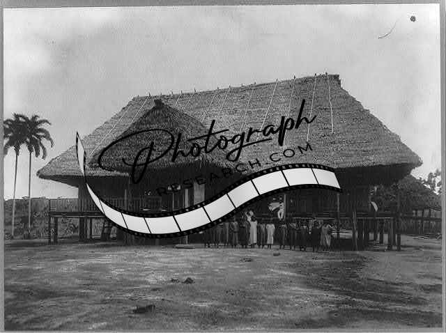 Station where dried latex is sold,Indian women,thatched roof building,1890-1923