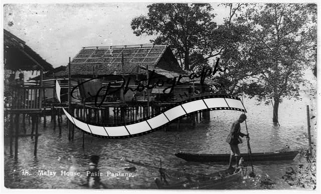 Malay house,stilt house,water,canoe,poles,Pasir Panjang,Malaysia,Gevaert,c1930