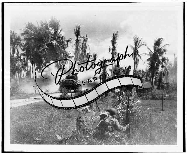 Title: Part of the Inf. Co. of 7th Div., U.S. Army halts in its advance on Kwajalein Island while a tank blasts a path into Jap[anese] positions / official U.S. Army photograph.
