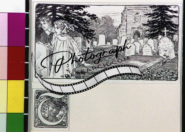 Boy,girl in cemetery,initial letter T around face of Puck,Frederic Dorr Steele
