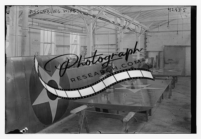 Assembling plane wings,airplane productions,workers,equipment,Bain News Service