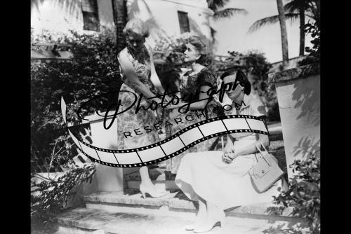 Barbara Hutton seated, with her husband Porfirio Rubirosa standing beside her, on steps outside house