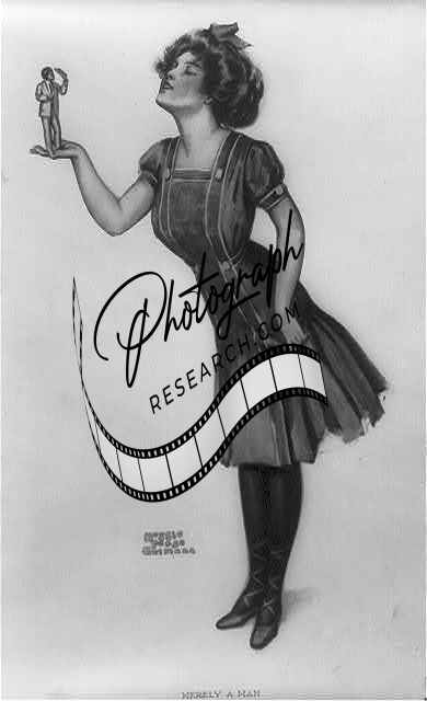 Merely a man,Woman holding miniature man in palm of her hand,c1910,Caricature