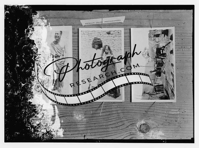 Title: [Copy of photographs showing: men and women seated in a semi-circle outside a building, some with patches on their eyes (top); group portrait of men standing, holding canes? (center); and Iranian? women and children seated with Caucasian women holding a baby (bottom)]