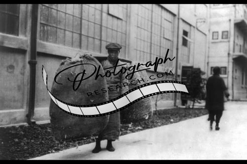 A Chinese man carrying cotton 200 lbs.,Shanghai,China,1924,sidewalk,buildings