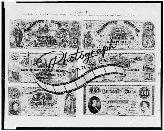 Photo of Six piecs of Confederate paper currency, 1875,money