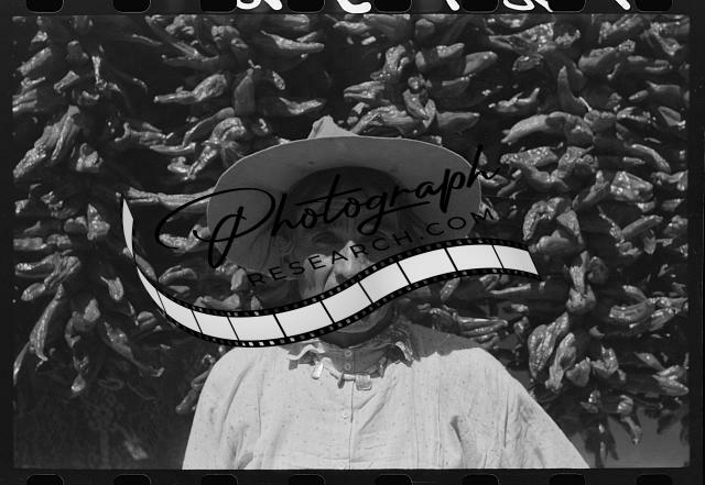 Title: Hanging up chili peppers for drying, Isletta, New Mexico